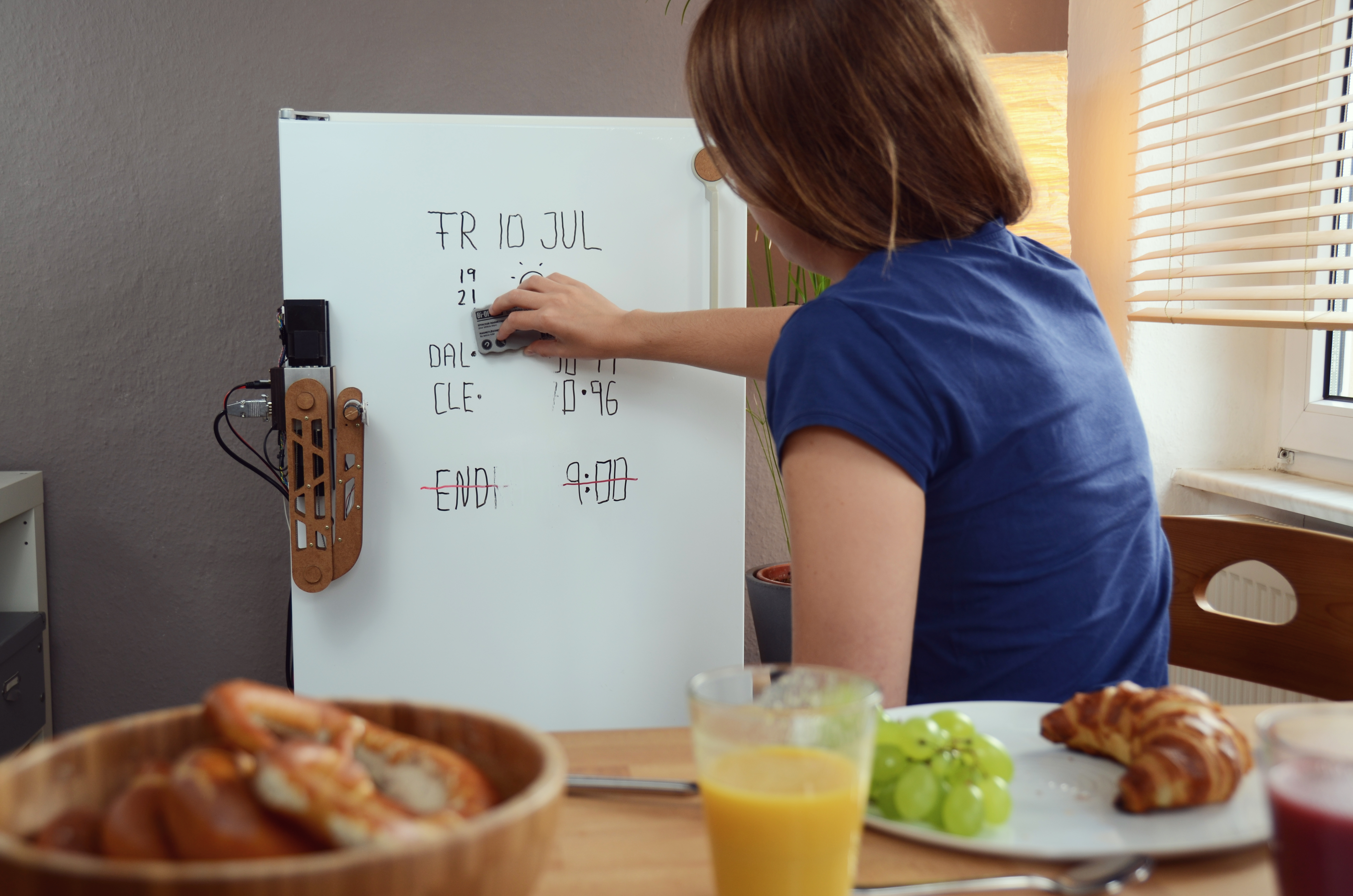 Die dafür verwendete Schreibfläche ist ein beliebiger Ort in der eigenen Wohnung und kann der Kühlschrank, ein Fenster oder auch eine Tischplatte sein an welcher der Arm befestigt wird. Die Mechanik für Ober- und Unterarm arbeitet mit zwei hochwertigen Schrittmotoren. Ein weiterer kleiner Servomotor hebt und senkt den Stift.